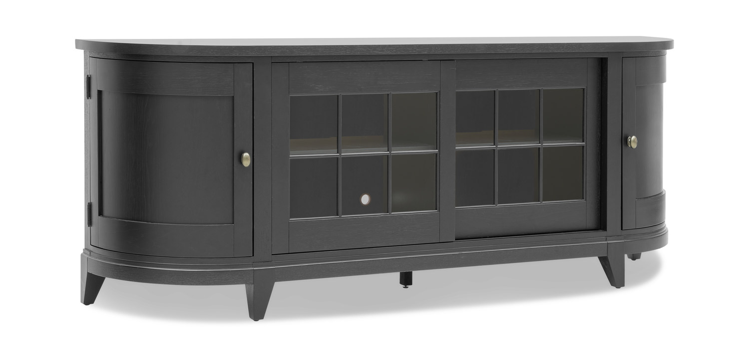 The elegant blacksmith finish on the Clear Lake Media Console allows a bit of the grain of the hickory wood to come through. This large console has 4 adjustable shelves, 3 outlets for your components, glass doors and curved doors. It features a center leg for additional support.