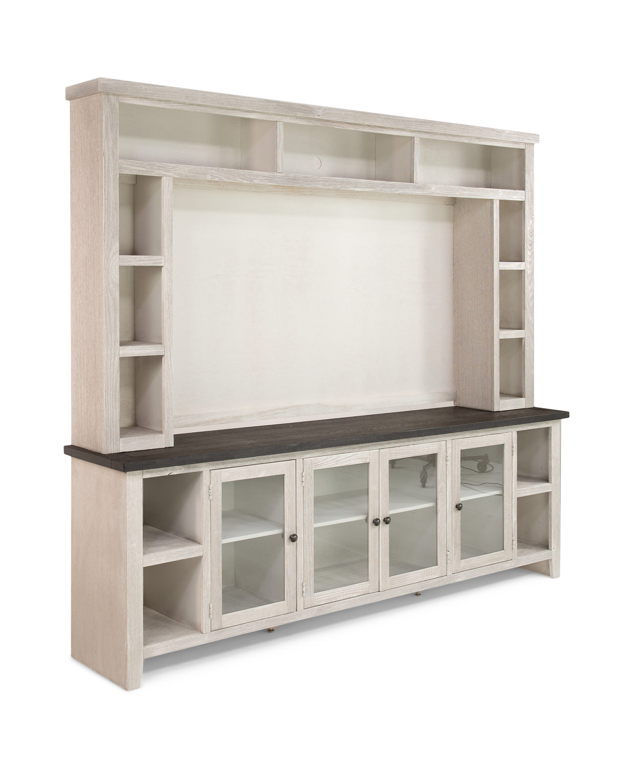 Create a new focal point for your TV viewing. The Eastport Console With Hutch offers space to show your collectibles and make the movie night special. Accommodates a 75" class TV with the console hutch. Made of hardwood solids and veneers with a wire brush finish.
