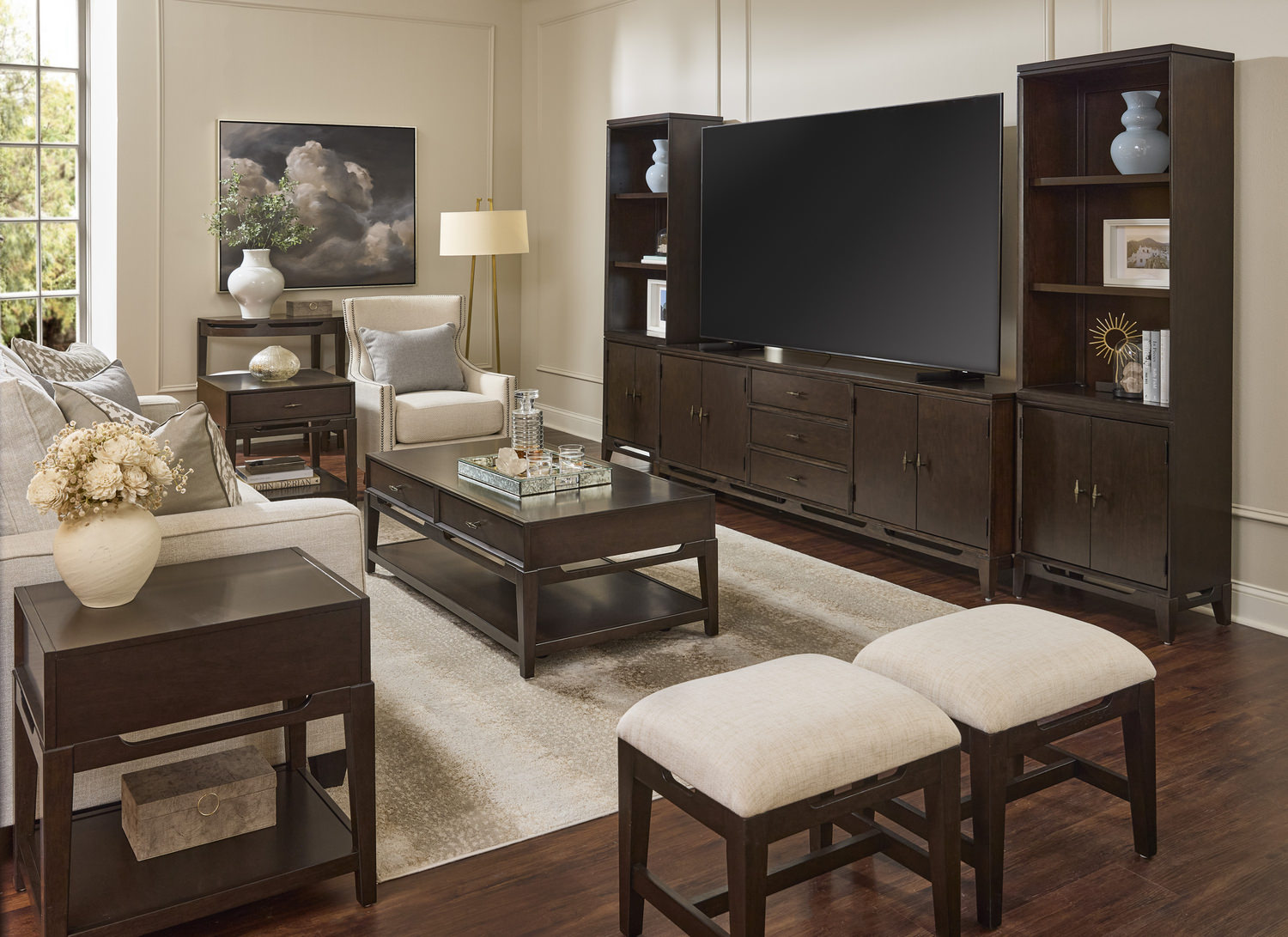 Get ready for movie time or to watch the big game with the Sutton entertainment wall as the focal point in your room. Accommodates TVs in the 85" class, this wall system has storage for your accents, collections and for all your media needs. Made with rich cherry veneers in a rich brown finish with modern hardware and details.