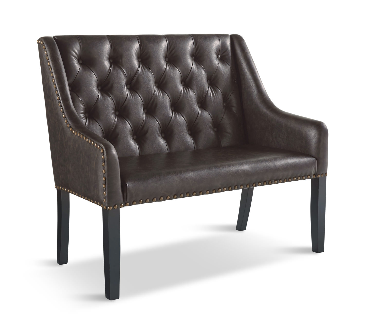 Refreshing to the current trend of casual lifestyles, Carondelet Accent Settee offers a button-tufted back, in a faux leather cover, complete with brass-tone nailheads. The wooden legs are finished with a complementary dark brown. Great extra seating for a great, living or family room, as well as useful in a bedroom or den/office due to its small footprint. Please note customer assembly is required.