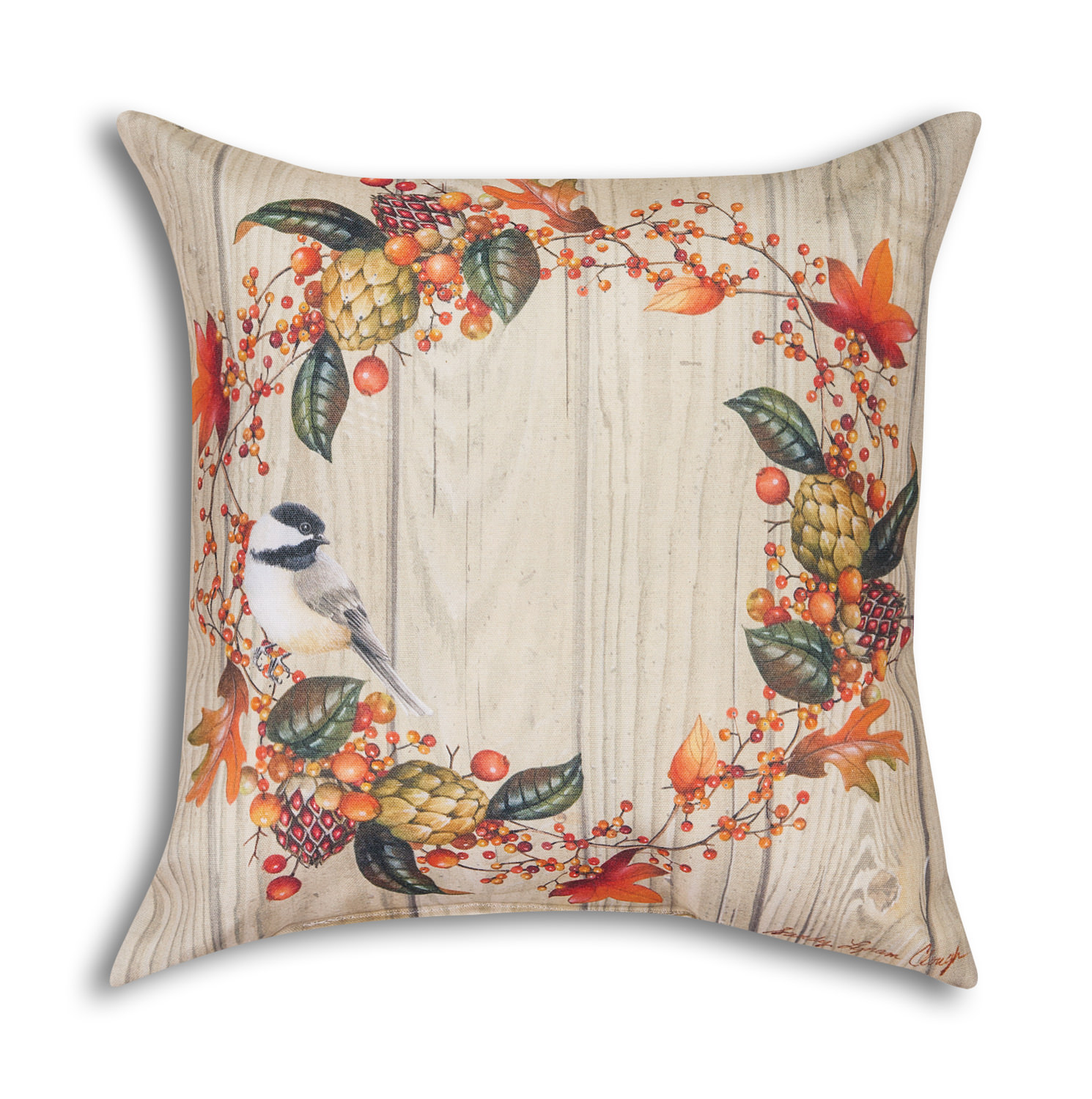 This autumn pillow from Manual Woodworkers & Weavers has a reproduction print titled "Harvest Gathering" from original art by Sandy Lynam Clough. Crafted in Climaweave ™ fabric that is a four seasons of year round living inside or out product. 18" X 18" size for use indoors or on the porch.