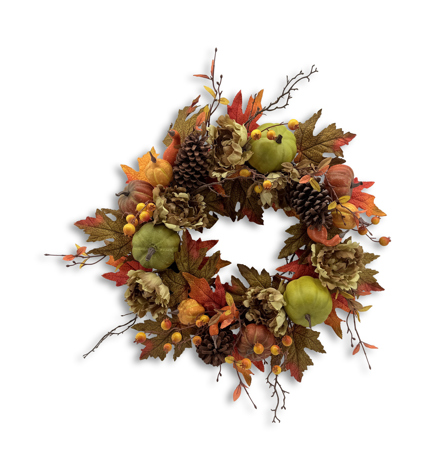 Welcome to HOM Furniture's Fall Harvest collection, where nature-inspired beauty meets cozy autumn charm! This 22" Fall Harvest Wreath is the perfect addition to your seasonal decor, featuring a delightful mix of faux pumpkins, maple leaves, berries, and pinecones in vibrant orange, yellow, and green hues. Its transitional style effortlessly blends farmhouse and mission elements, making it a versatile piece for any home. While some shaping may be required upon arrival, this wreath is sure to bring a touch of fall magic to your indoor space. Embrace the warmth of the season with this stunning holiday decoration from HOM Furniture! Shaping required.