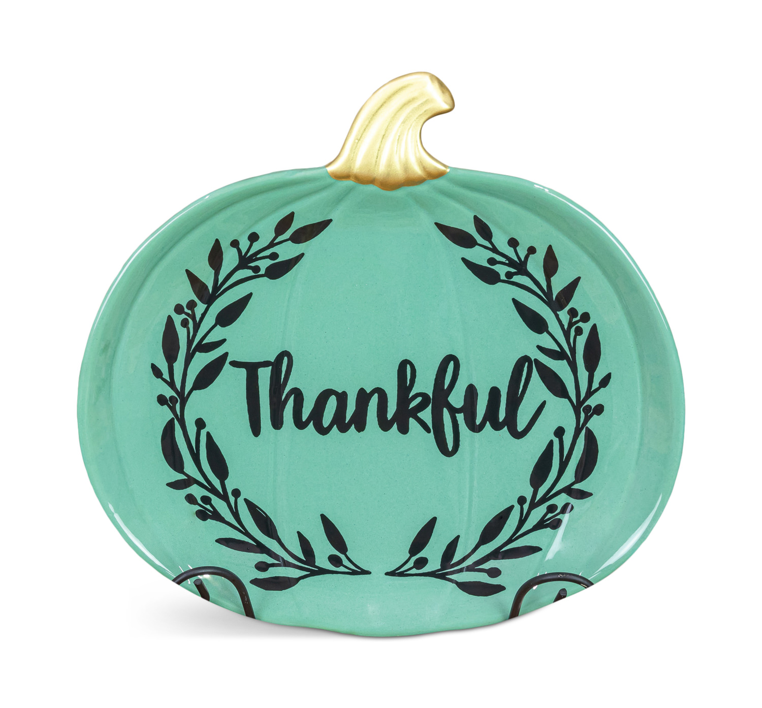 This beautiful mint green candy plate is sure to bring the perfect touch of autumn style to your home. The plate is adorned with a gleaming gold stem that adds an elegant look. The word "Thankful" is delicately inscribed across the center of the plate. Perfect for displaying treats at family gatherings.