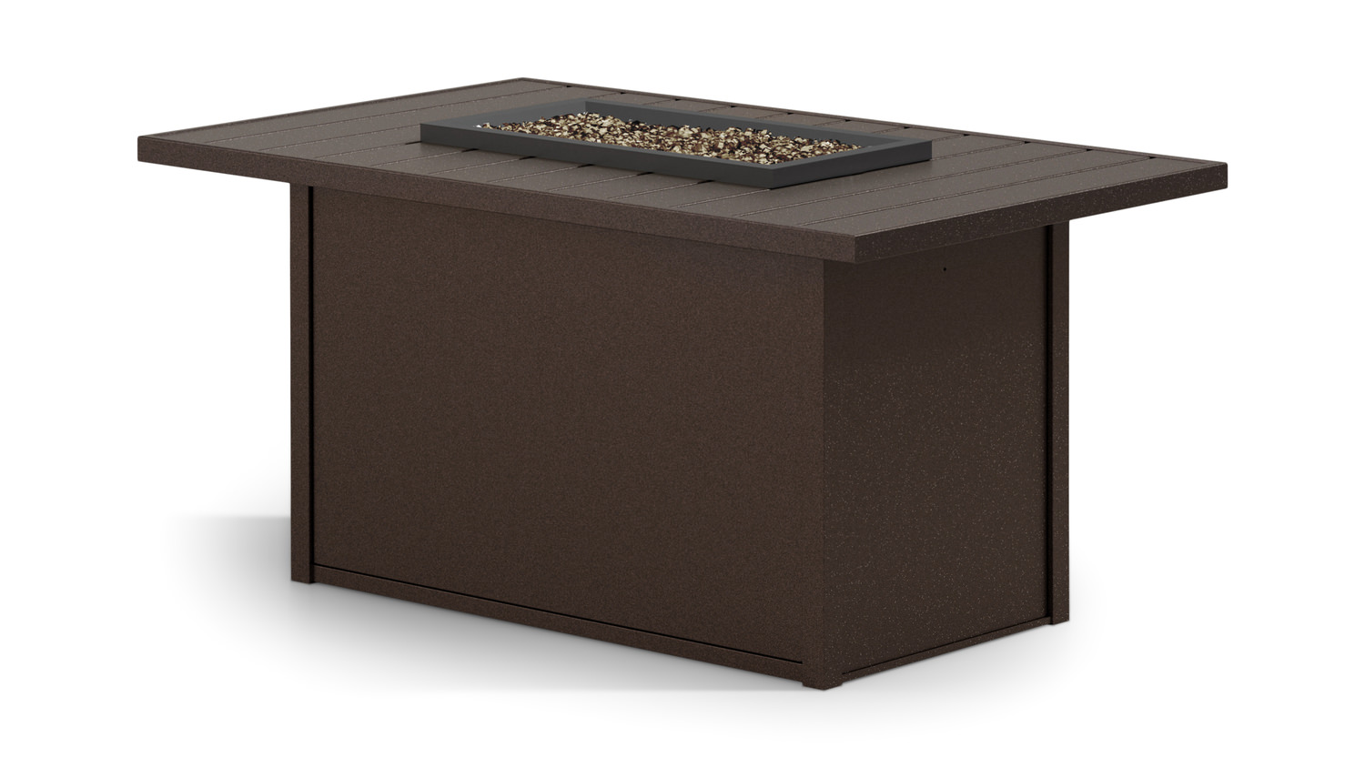 Made in Minnesota by Homecrest, the 32" x 52" Breeze Fire Table features a straight-line slat top table with an Aurora rectangle fire table base. This 24.5", chat-height fire table was created with an all-aluminum base and slat top in a Sedona powder coat finish. The fire table uses a 20 lb LP tank stored in the base, sold separately. The fire table is a match light system for easy start, with a fire bowl lid and 20 lbs of fire glass beads. The max output is 60,000 BTUs.
