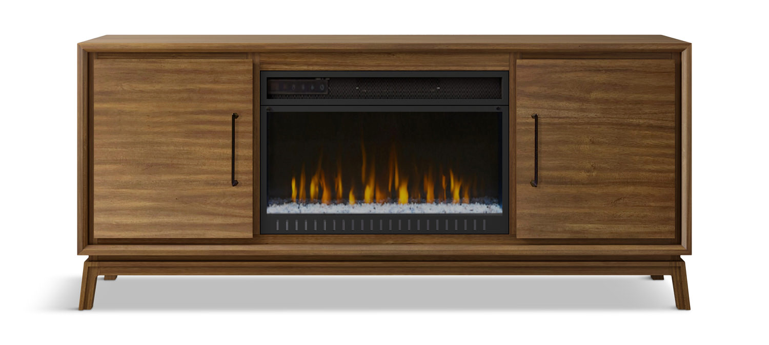 Accent your space with the Midcentury look of the Burrell 64" media console with electric fireplace. This natural wood finish with enhanced grain doors and subtle hardware is a classic look. The crystal glass firebox adds to the design. Use with our without heat to supplement up to 400sf. The infrared technology is energy efficient and heats evenly and comfortably. The LED fire display has 4 flame settings and a 12 hour programmable feature. It also includes a remote control. No special electrical is required.