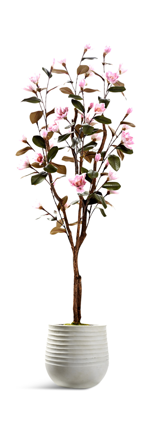 Introducing the 7' Pink Magnolia Tree by HOM Furniture, a delightful addition to your indoor space. This tree features beautiful pink magnolia flowers in full bloom, adding a touch of nature's beauty to your home. Nestled in a white, detailed pot, this tree is both simple and fulfilling, bringing the outdoors inside. Enhance your space with the elegance of blooming magnolia flowers and create a serene ambiance in any room.