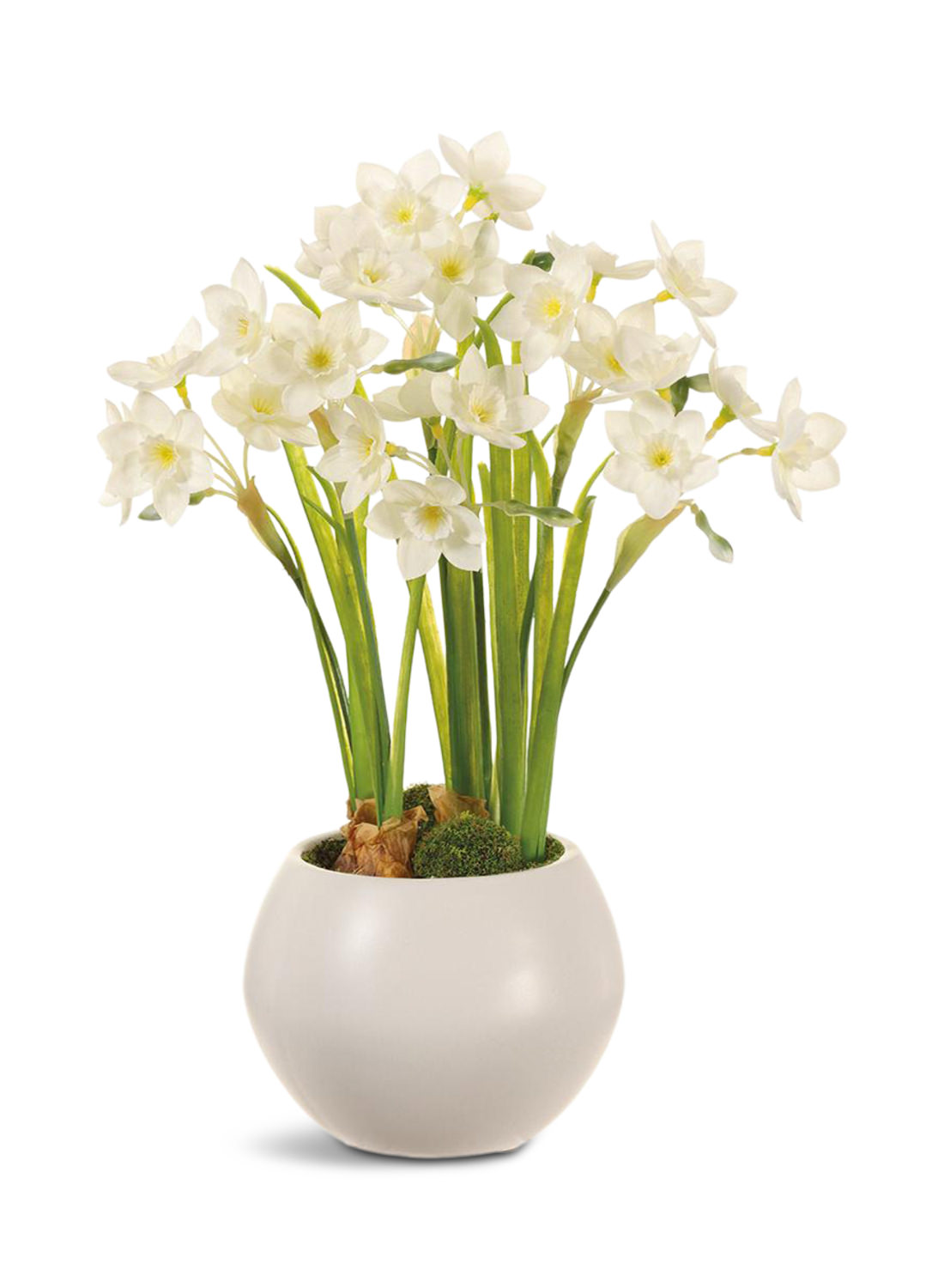 Introducing a stunning addition to your home décor by HOM Furniture - a beautiful floral piece featuring blooming white paperwhites with long stems, elegantly displayed in a round ceramic white vase. Paperwhite is perfect for bringing a touch of nature indoors. Add a refreshing and charming atmosphere to any room with this exquisite arrangement.