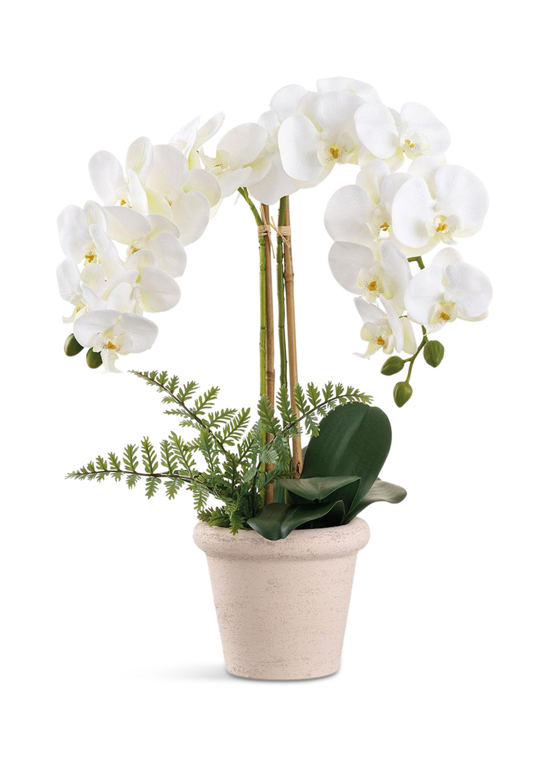 Discover the perfect touch of elegance and sophistication with the Phalaenopsis White Orchid from HOM Furniture. This stunning tabletop plant will breathe life into any space, making it the focal point of the room. With two beautiful orchids nestled amongst a lush mixture of greens in a chic white terracotta planter, this piece exudes a sense of natural beauty and charm. Bring a sense of adventure and style to your home with this exquisite floral product from HOM Furniture. The Phalaenopsis White Orchid is a true statement piece that will captivate your guests and elevate the ambiance of any room you place it in.
