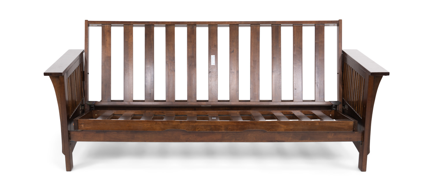 The Autumn Futon Frame is constructed of solid hardwoods with a black walnut finish. It features a front loading mechanism for ease of use. The futon has three positions, one upright seated, next a slight reclined position and lastly a full bed. Perfect for a bedroom, cabin or office.