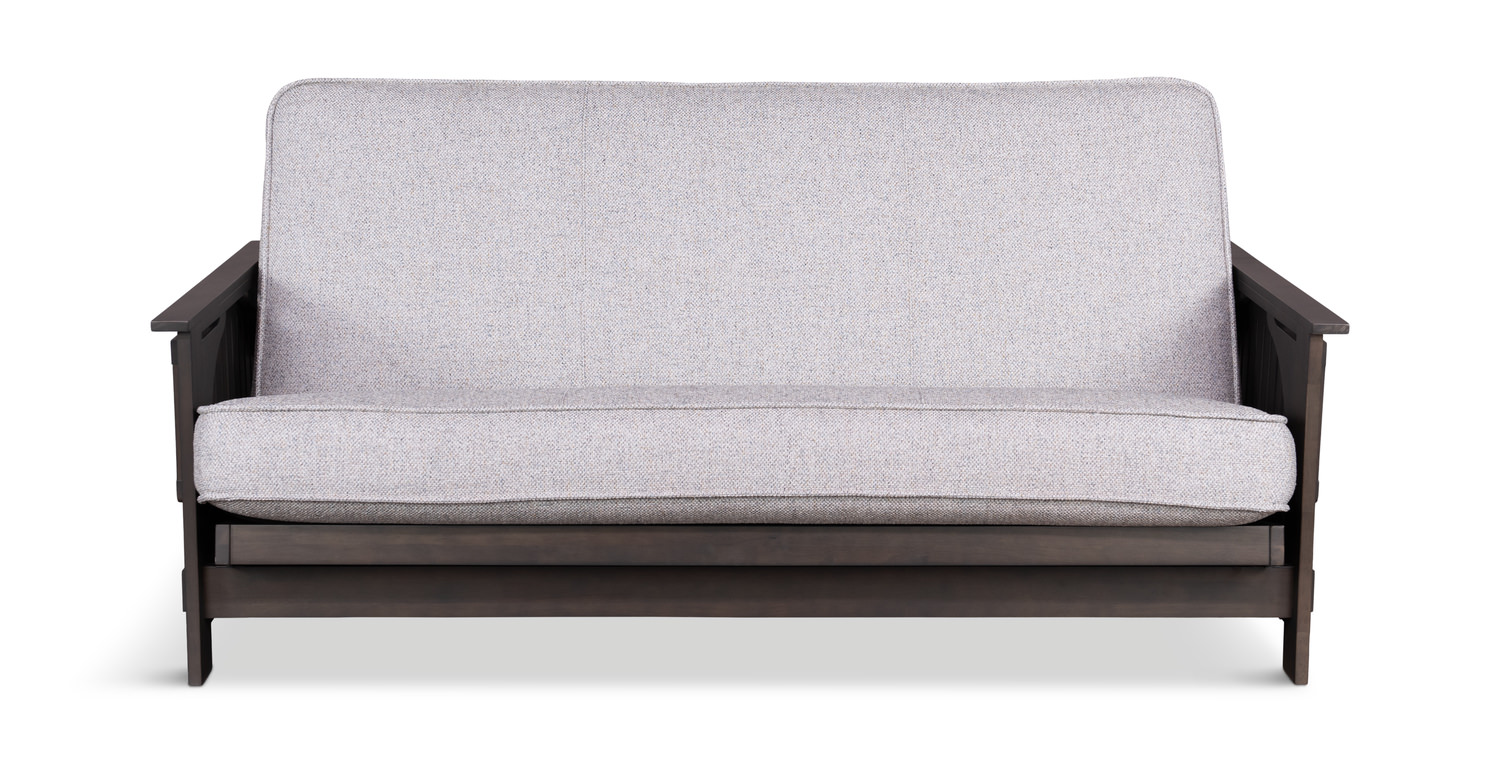 Introducing the Borden Futon with a fold out side table, a stylish and functional addition to your living space from HOM Furniture! This futon features a convenient fold-out side table with a built-in USB port, making it easy to charge your devices while relaxing. The 6-leg support system and solid hardwood frame provide stability and durability for years to come. The hinged mattress allows for a clean presentation when transitioning from sofa to bed, while the zero wall clearance design saves space in your room. The medium finish on the solid hardwood frame gives a warm and inviting look, perfect for any transitional style décor.