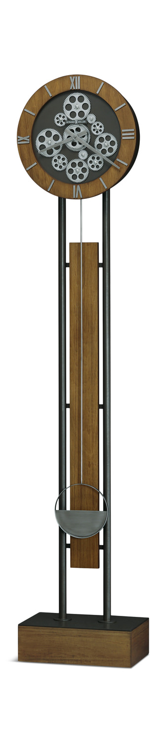 This industrial-style grandfather clock has moving gears on the dial that are an aged silver finish. The wire brush clock face bezel and base are an aged amber brown complemented by charcoal grey industrial style metal tubing and aged silver finish split pendulum and Roman numeral detail on the 1/4 hour markers. This simple design is the perfect vertical accent for any room. The quartz mechanism is battery-operated.