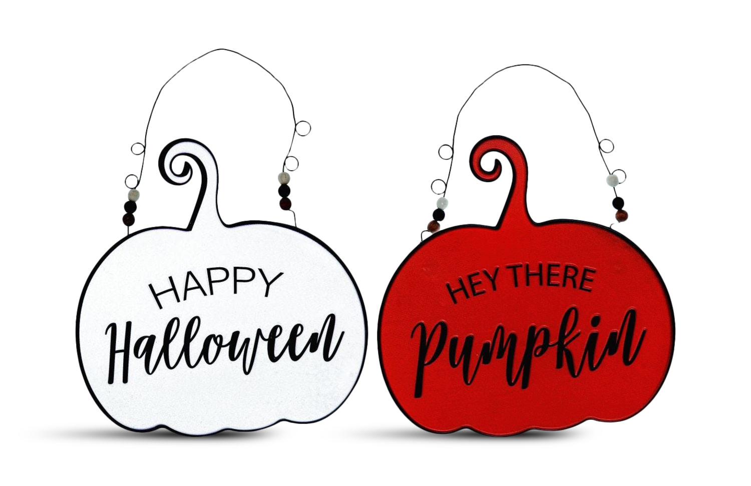 Hang on your door, in your kitchen or on your wall, these metal pumpkin hangers. Choose from either "Happy Halloween" or "Hey There Pumpkin". Each sold separately.
