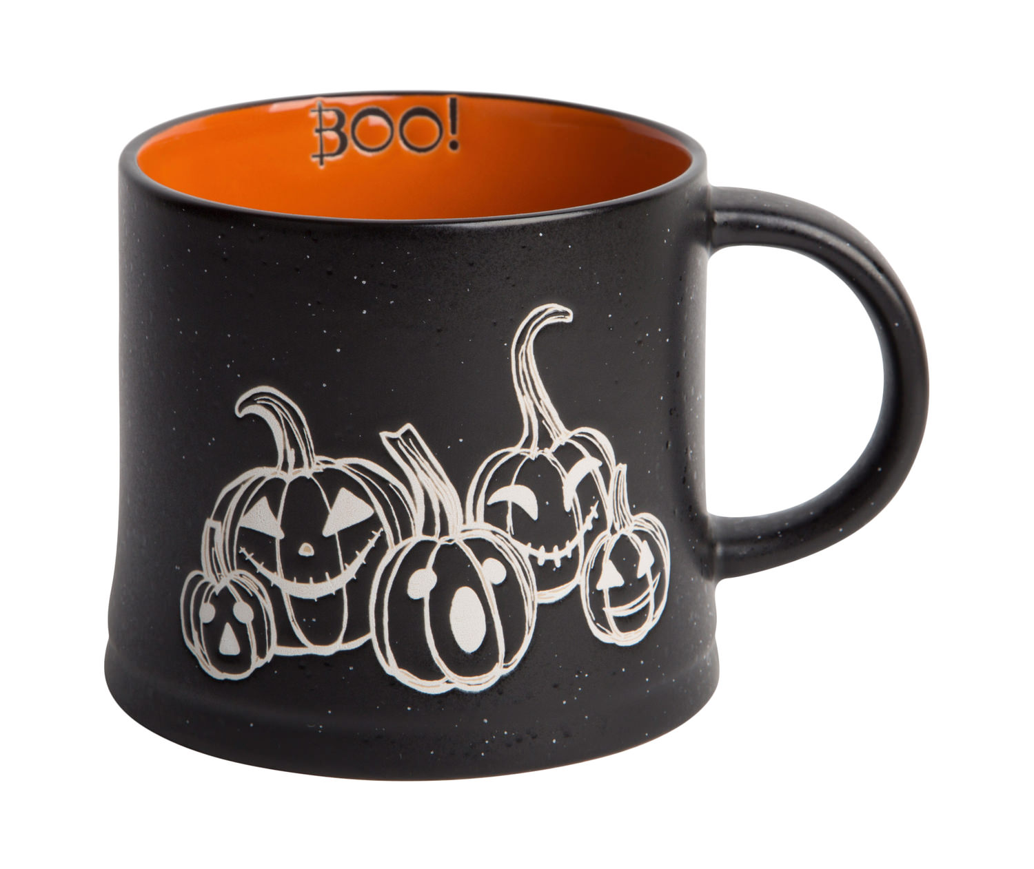 Enjoy your favoriete pumpkin spice latte or your own grueling potion in this black mug accented with white pumpkins. The inside features an orange color and "BOO!" imprinted in black.