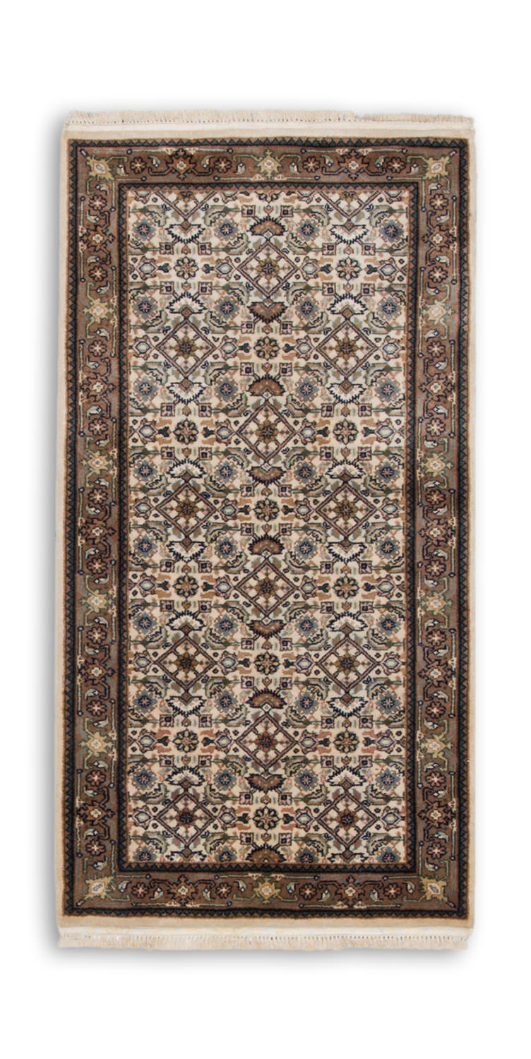 This beautiful one of a kind rug was hand selected by our rug buyers in India. It is hand knotted and made of 100% premium wool and will add color and warmth to any room. This brown and beige area rug features a traditional pattern, yet it can suit a wide variety of room styles. This rug is only available at the specified showroom listed.