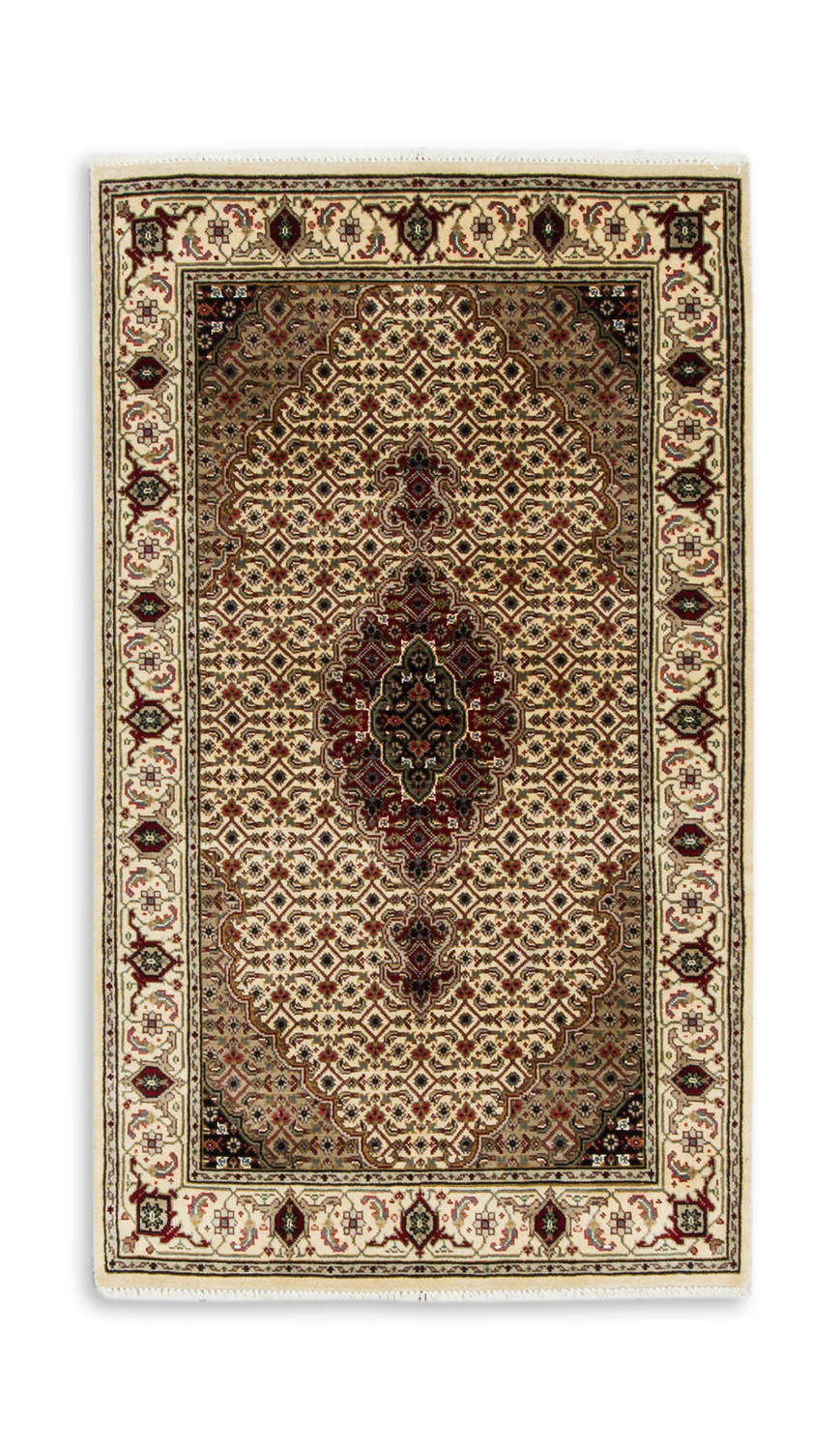 This beautiful one of a kind rug was hand selected by our rug buyers in India. It is hand knotted and made of 100% premium wool and will add color and warmth to any room. This beige and black area rug features a traditional pattern and a border as part of the design. This rug is only available at the specified showroom listed