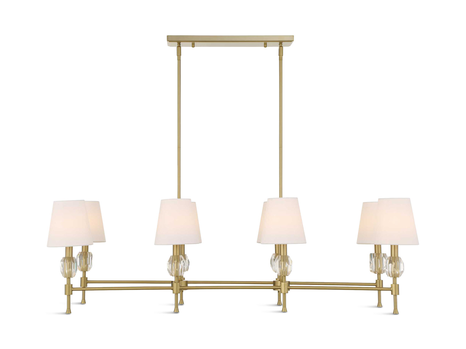 Elevate your space with the exquisite Arques 8 Light Linear Chandelier from HOM Furniture. This regal piece exudes sophistication with its warm natural brass finish and sparkling clear cut crystal accents. Topped with elegant tapered white silken shades, this chandelier is a true statement of luxury. Illuminate your room with the 8-60 Watt max candelabra sockets, allowing you to customize the lighting to suit your ambiance. The Arques Chandelier comes complete with 20 feet of wire, 6-12" stems, and 2-6" stems for adjustable installation, ensuring a perfect fit for any room.