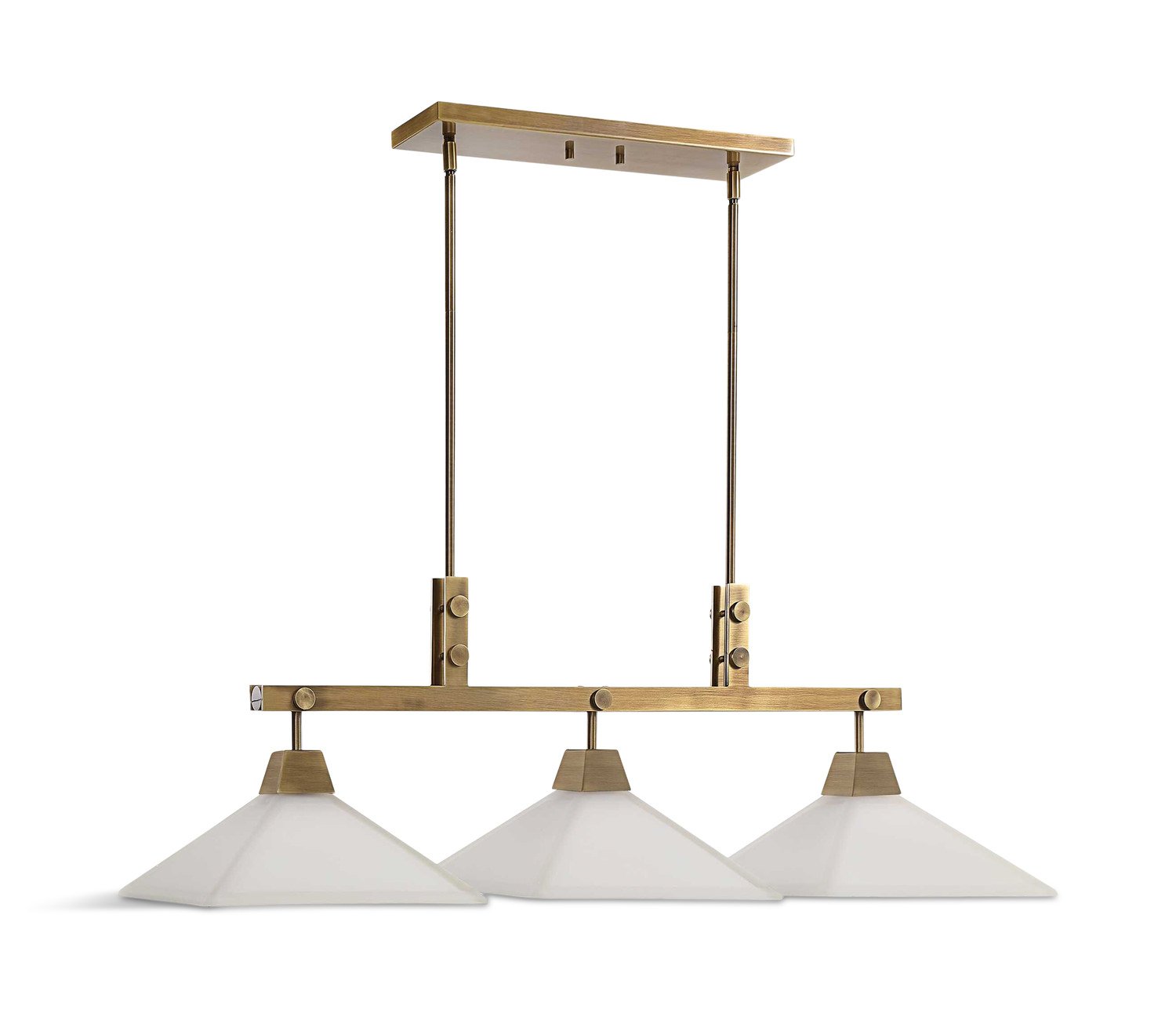 Transform your space with the Brookdale Industrial 3 Light Linear Chandelier by HOM Furniture. This exquisite chandelier combines aged brass with an enriched industrial style, accented by subtle craftsman lines for a touch of sophistication. The elegant linear design is further enhanced by etched, white frosted glass shades that exude a soft, inviting glow. Crafted with attention to detail, this chandelier features 3-100 Watt max Edison sockets, offering ample illumination for any room. The aged brass finish adds a timeless appeal, creating a warm and welcoming ambiance.