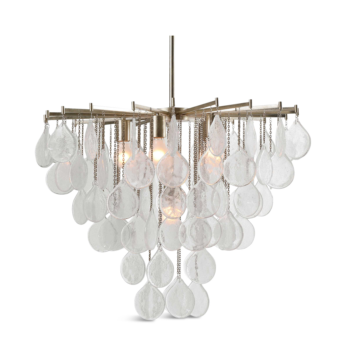Illuminate your space in style with the Goccia 6 Light Tear Drop Glass Pendant from HOM Furniture. This exquisite pendant features a classic tear drop shape crafted from sumptuous seeded glass, suspended elegantly on fine chains that refract light beautifully. The design transcends traditional aesthetics, seamlessly blending with contemporary interiors. Finished in a rich antique bright silver leaf, this pendant exudes sophistication and charm. The Goccia pendant accommodates six 60 watt max Edison sockets (bulbs not included), ensuring ample brightness for any room.