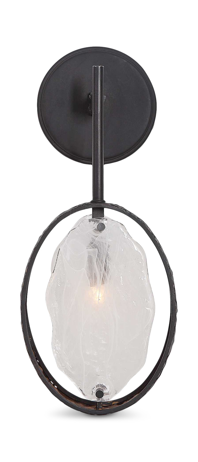 Elevate your space with the exquisite Ring of Dark Hammered Bronze Finished Metal from HOM Furniture. This striking piece features a subtle golden interior that adds a touch of luxury to any room. Inspired by mid-century modern design, the ring holds two handmade artisan-inspired clear and white swirl glass ovals, creating a stunning visual appeal. The sconce is equipped with a 1-40 watt max G9 socket (bulbs not included), ensuring a warm and inviting glow in your home.