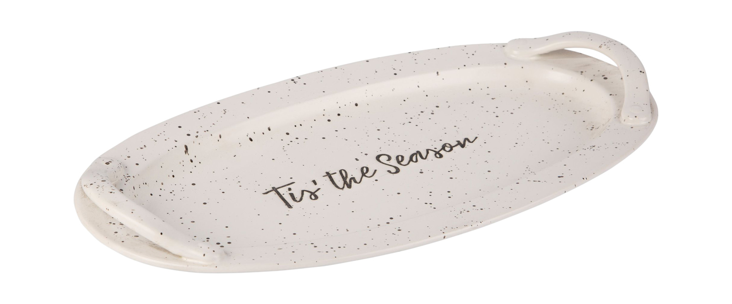 This festive oval platter from HOM Furniture is the perfect way to get into the holiday spirit! It features a charming black and white speckled design with a cheerful "Tis the Season" saying in the middle. The convenient side handles make it easy to pass around snacks and small treats or your favorite dishes at your next gathering. This platter is also great for gift-giving, making it an ideal present for family and friends this holiday season. So don't wait—get ready to celebrate!