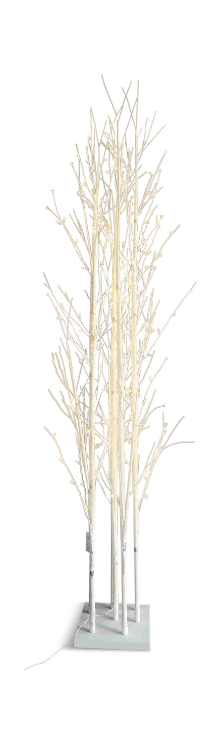 Add lighted charm of a cluster birch forest to a living room, entryway or great room for the holidays or year round. Crafted from metal frames with white paper wrapped tree trunks and pre-lit with 240 warm white LED, low voltage lights. Powered by a transformer plug for use with a standard outlet. This tree requires simple assembly and is easy to move. Designed for use with the square wooden base platform alone or to be added to a container (basket or pot base) sold separately. Ships in a single carton. Designed for indoor use.
