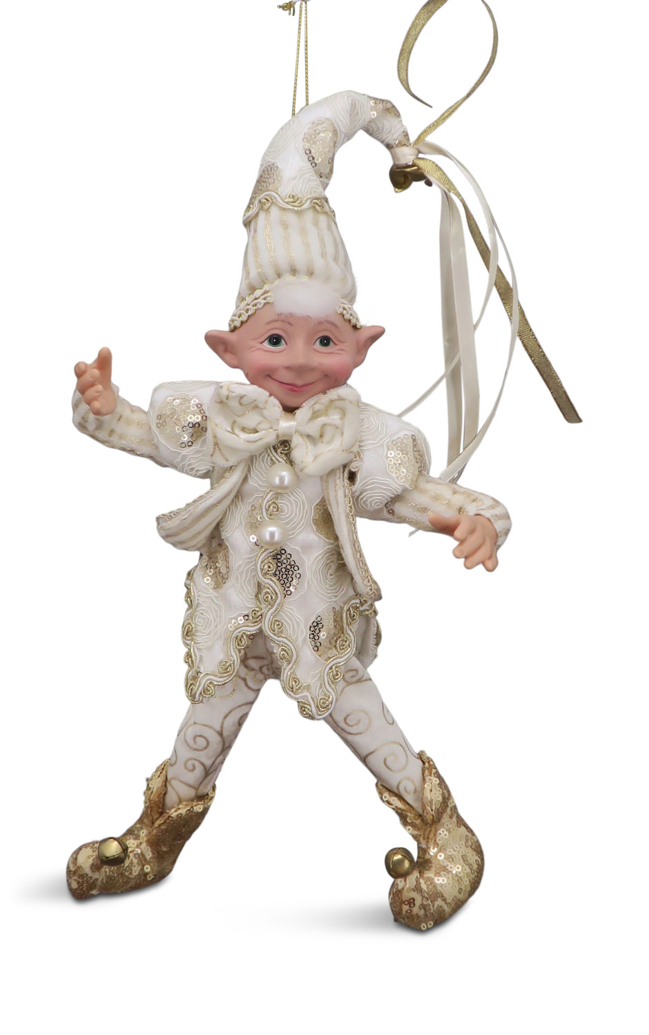The 16" Gold/Ivory Elf is dressed up in a gold and ivory suite including a bow tie, hat with bells and is very bendable to place in various positions on your mantel, banister or just hanging on your Christmas tree.