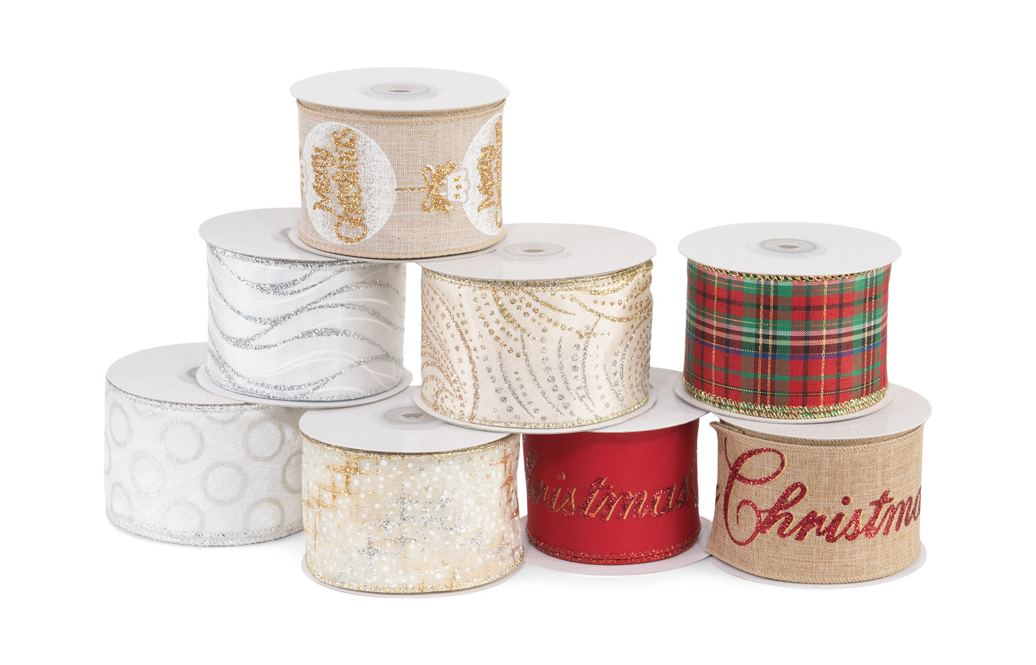 The Natural Merry Christmas Ball Ribbon is printed with decorative Christmas balls accented with gold "Merry Christmas". Measures 2.5" x 10 yards.