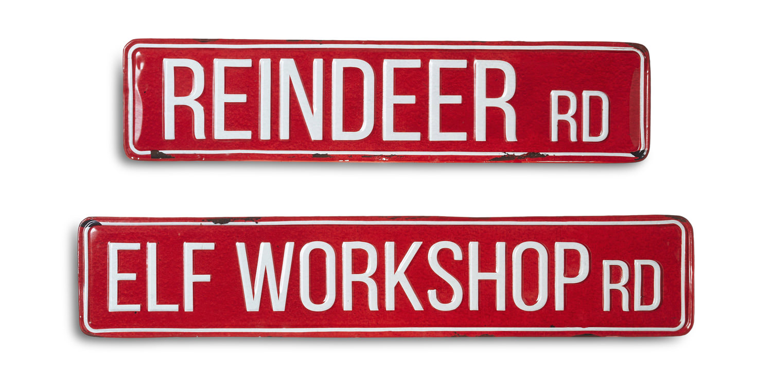 Choose from either Reindeer Road or Elf Workshop Road sign ornaments. They measure 20" long and 4" tall and are sure to add a little festive touch to any living space in your home. Each sold separately.