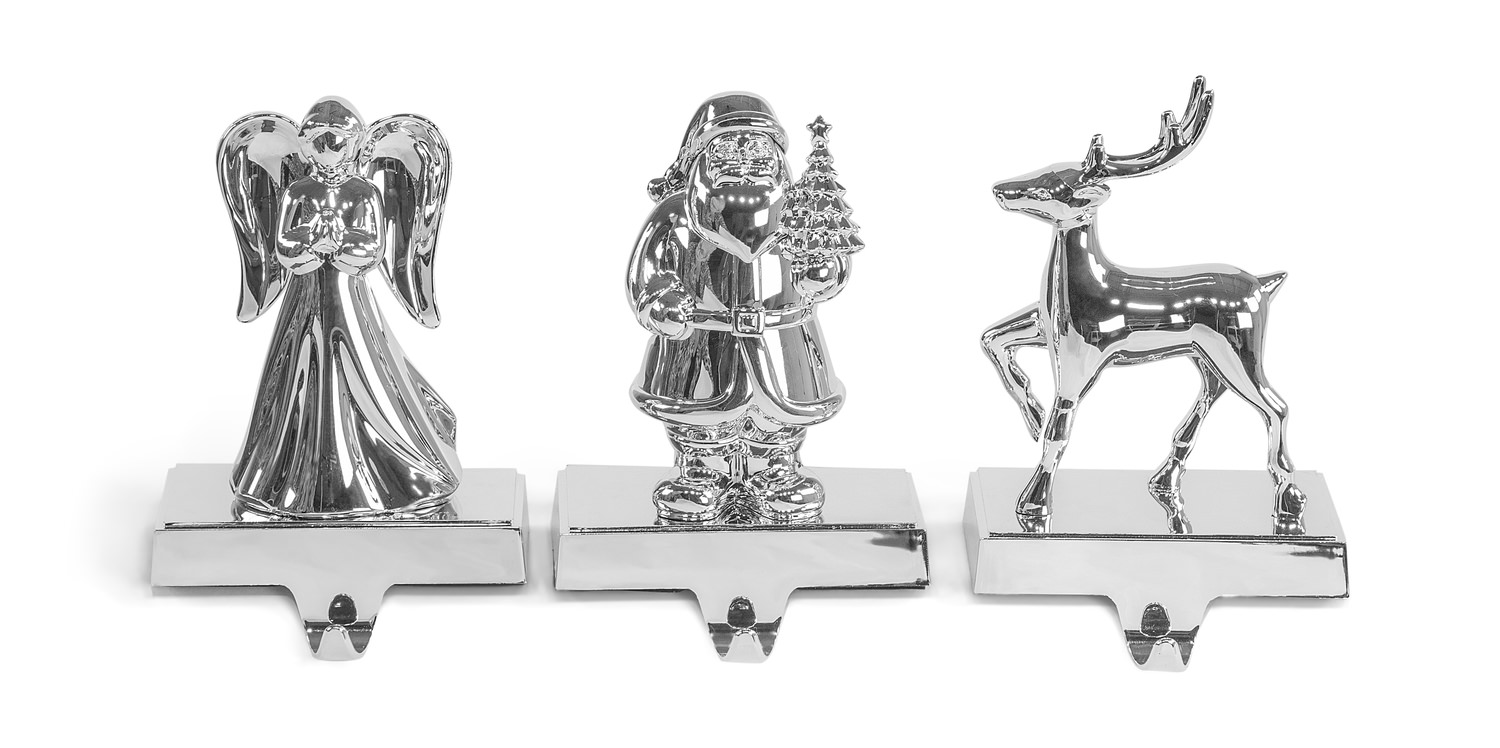 Accent the fireplace mantel or bookshelf with a contemporary stocking holder design crafted from metal for weighted base and finished in gloss silver. Perfect to hang a new decorative style or traditional favorite stocking, ready to be filled with goodies for Christmas day. Assorted styles to choose from, sold each, displayed in select Seasonal Concepts Christmas departments in HOM showrooms. Each sold separately.