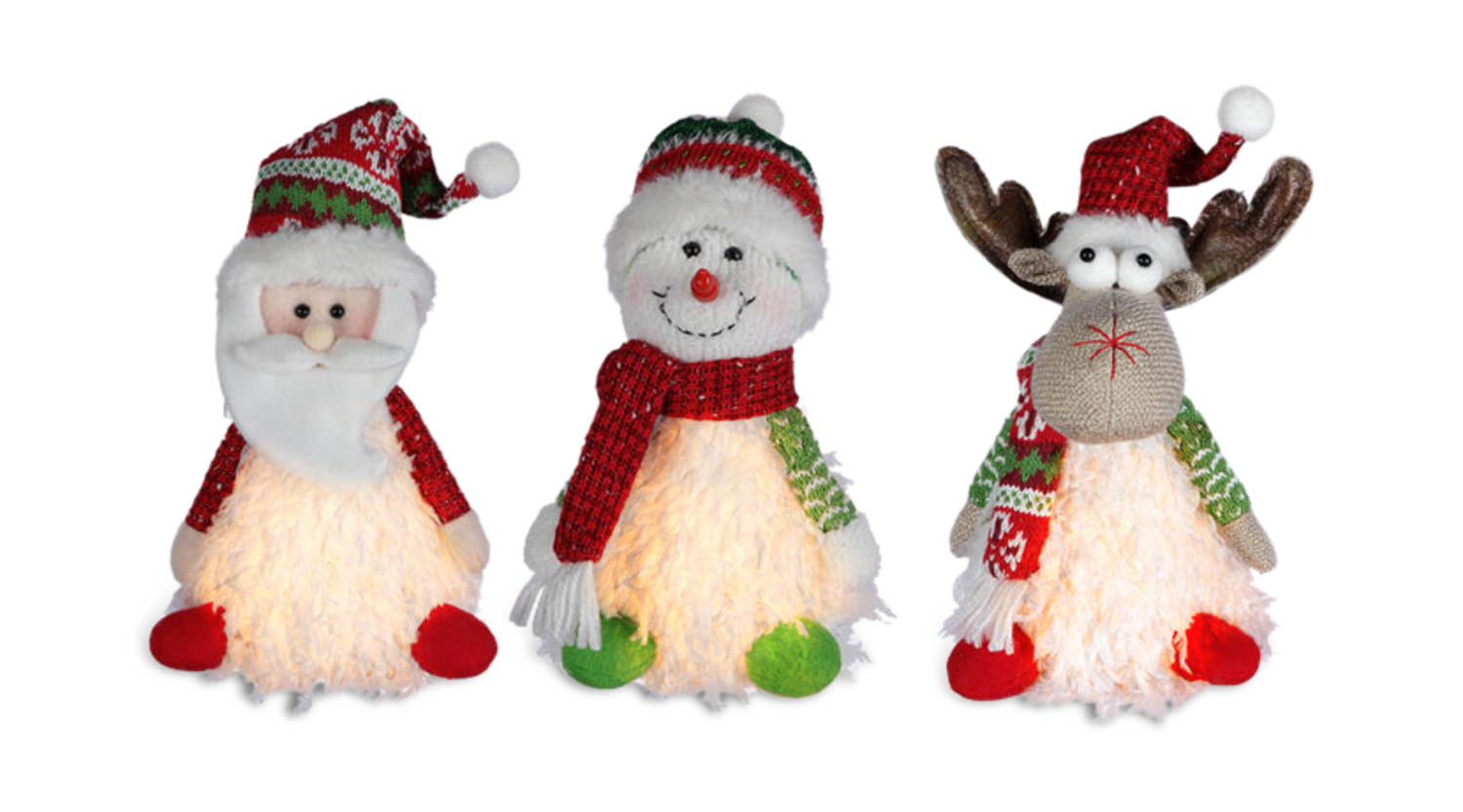 Look at these 9" traditional assorted figures - Santa, Snowman and Reindeer. All in their outfits. Make them glow at night with their LED lights. Each sold separately.