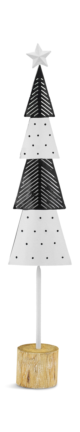 Welcome the holiday season with a festive décor piece! Our Black and White Tree is perfect for adding a modern, seasonal touch to your home. This stylish tree features black metal with white stripes and white metal with black dots and is topped off with a white metal star. Standing 22.5" tall, this sleek tree will make an exciting statement in any living space.