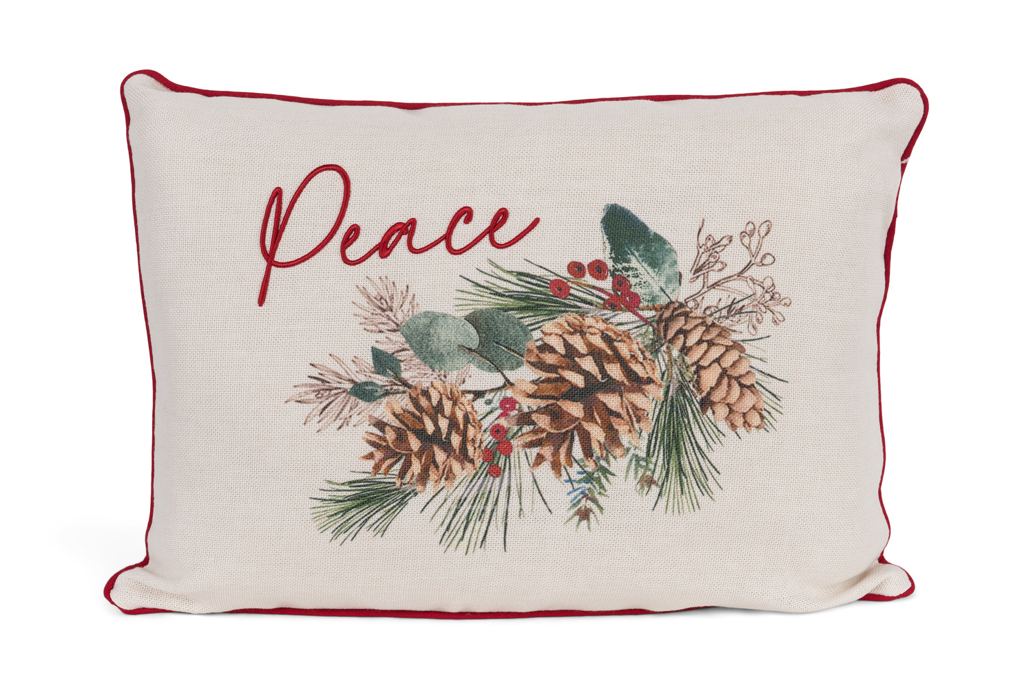 A classic Christmas thought, Peace, with red embroidered lettering on natural background fabric and pine branch image of snowy boughs and pinecones. A wonderful addition for a message in a home with holiday decorating or a wonderful gift for a holiday hostess or loved one during the Christmas season. 100% polyester fabric cover & pillow fill. This pillow has an accent color piping to set off the image & message. Shown in select Seasonal Concepts departments, also available online for pick up at a HOM location. Limited quantity seasonal item.