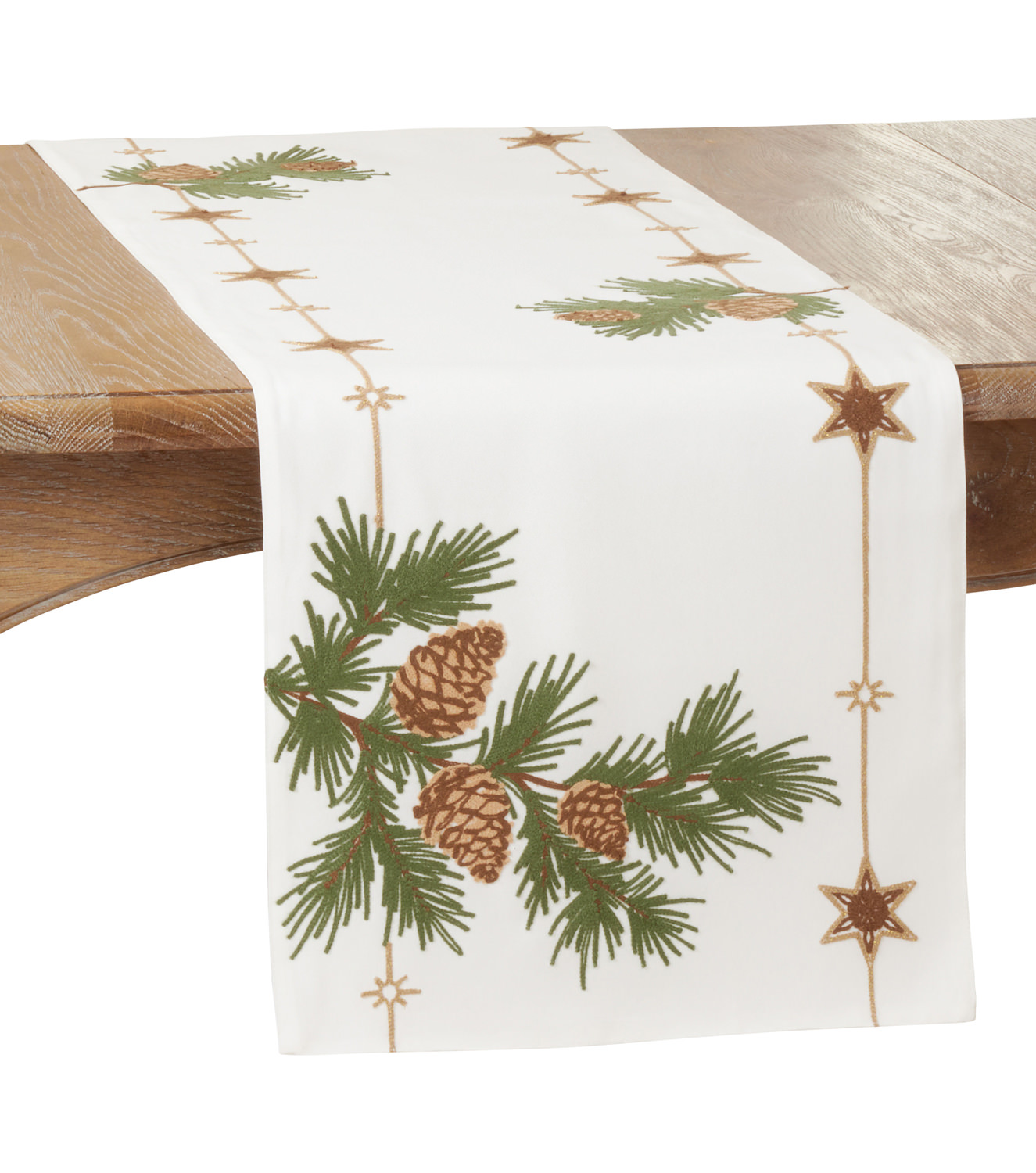 Bring an extra dose of nature to your table with this 16" X 70" table runner, featuring pine branches with pinecones and gold stars that line the length. Adds rustic charm to any holiday event–from Thanksgiving to New Year's Eve. Dressed up or down depending on the occasion, this runner will soon be a staple for all your most loved holiday feasts.