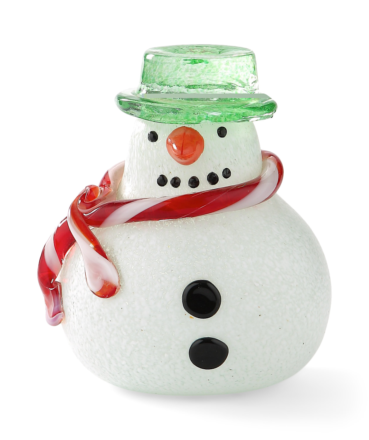 This adorable 6" Glass Snowman is the perfect addition to your holiday decorations. Featuring a white body, a festive green hat, and a bright red and white swirled scarf, this smiling snowman has an extra special touch of black "coal" eyes and buttons for added charm. Bring the spirit of winter into your home with this delightful glass snowman.