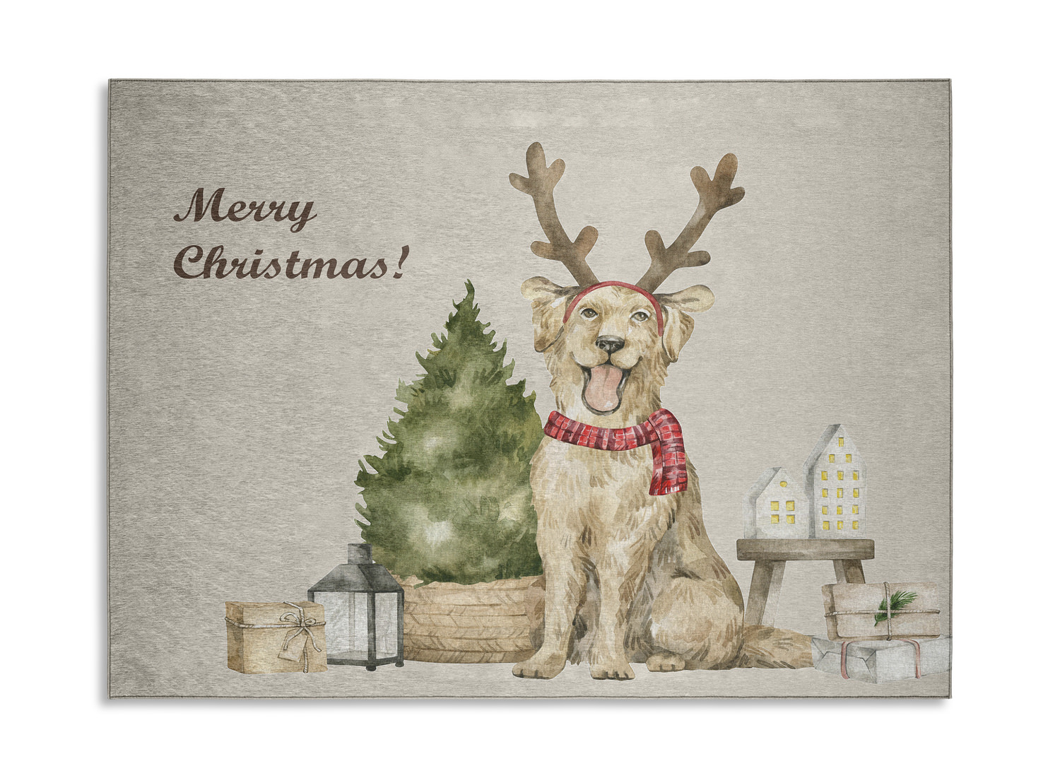 The Happy Dog With Antlers Rug from HOM Furniture, a delightful addition to your home this holiday season! Measuring 30" X 46", this charming rug features a cheerful Christmas dog with antlers, adding a festive touch to your indoor space. The green, red, and beige colors bring a cozy and transitional style to any room. Perfect for indoor use, this rug is both playful and practical. Bring some holiday cheer into your home with the Happy Dog With Antlers Rug from HOM Furniture!