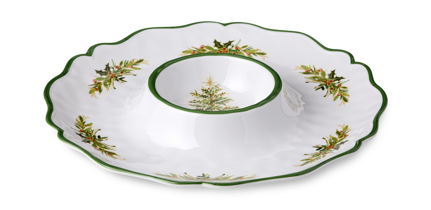 Introducing the festive Holly Tree Chip And Dip Tray from HOM Furniture! Perfect for adding a touch of holiday spirit to your gatherings, this 14.5" decoration features classic holly leaves, red berries in a vibrant green trim color. Crafted from durable plastic, this traditional-style piece is ideal for indoor use, making it a must-have for your holiday hostess decor collection. Elevate your entertaining experience with the Holly Tree Chip And Dip Tray - a delightful addition to your seasonal celebrations!