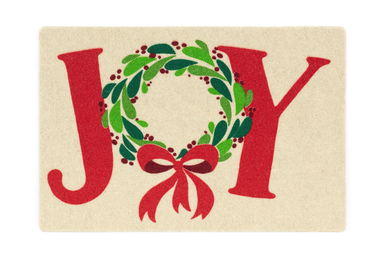 Everyone could use a little extra joy this holiday season, so bring home the 18" x 27" Joy Wreath Rug to add an extra festive touch to your home. This rug is made with a felted base and then a screen printed design of the word joy with the green wreath as the center. Bring this rug home to decorate your front entry or use in you kitchen as a perfect sink rug.