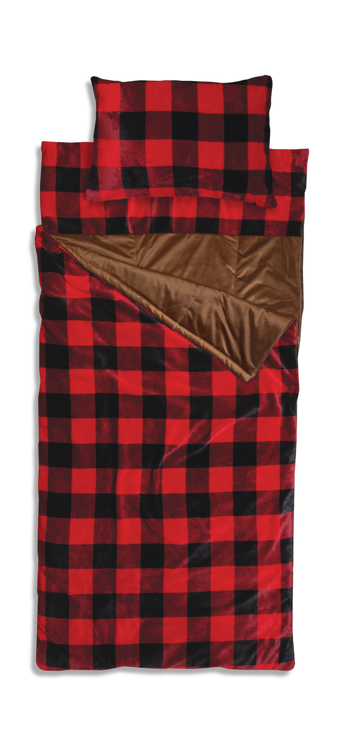 The Lumberjack Slumber Bag And Pillow from HOM Furniture! Whether your little one is heading to a slumber party or embarking on a camping adventure, this cozy sleeping bag is the perfect companion. The zip enclosure makes it a breeze to clean, while the super soft, sweat-proof shearling lining ensures maximum comfort all night long. Designed with easy-to-use straps for carrying and containing, this sleeping bag is both convenient and functional. The black and red colors add a touch of charm to any indoor setting. Crafted from durable polyester material, this sleeping bag is built to last.