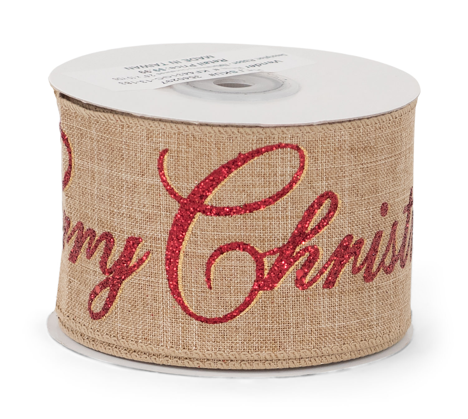 view storesRed glitter Merry Christmas ribbon on a natural brown color. Your packages will sparkle with joy. Measures 2.5" x 10 yards.