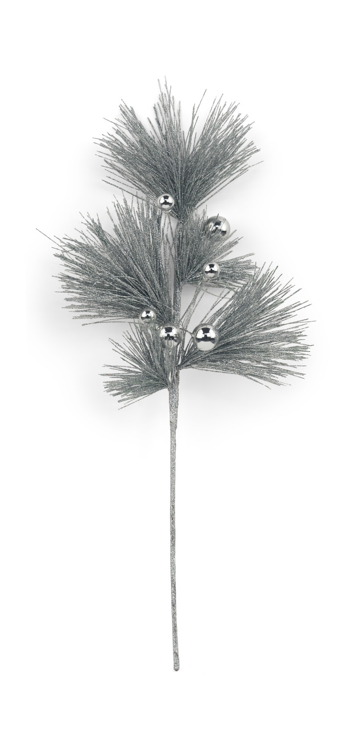 The Pine Ball Pick features green pine boughs decorated with small, silver holiday balls. Design a creation all your own with many of your favorite holiday picks, or add one or two to your favorite arrangement for that special seasonal touch. Perfect for a touch of green and adding a little sparkle to your home.