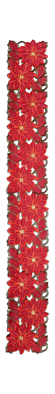Introducing the stunning Poinsettia Table Runner from HOM Furniture! Bring the festive spirit into your home with this elegant 72" long table runner featuring intricate cut-out red poinsettias with green outlined leaves, made from high-quality polyester material. Perfect for adding a touch of holiday cheer to your dining table, this traditional-style runner is 13" wide and designed for indoor use. Elevate your holiday decor with this eye-catching piece that will surely impress your guests. Let the Poinsettia Table Runner be the centerpiece of your celebrations this season!