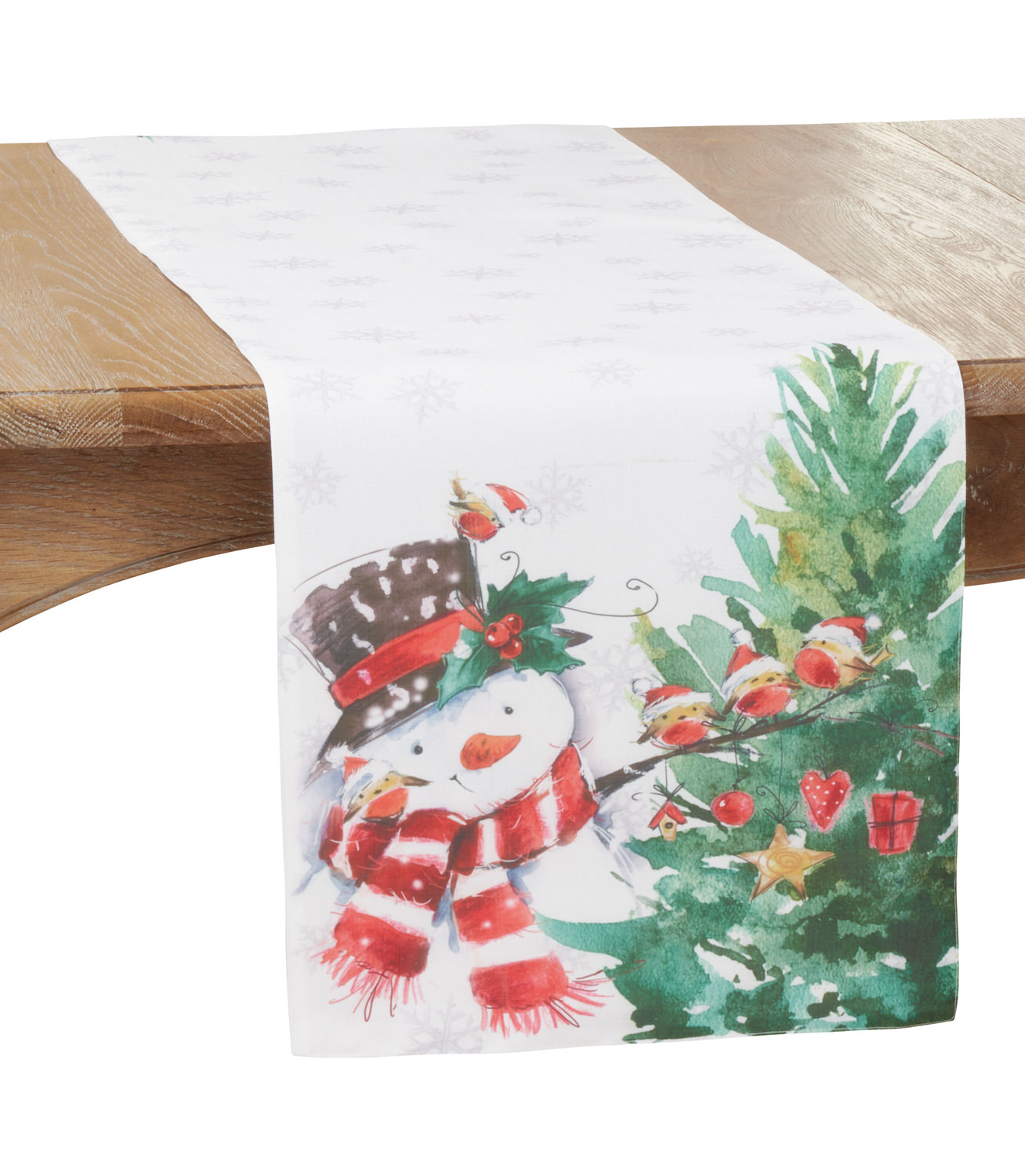 This Christmas Snowman Table Runner is suitable to decorate your kitchen table, farm table, dining table, holiday tables, etc. All bundled up with a black top hat, warm scarf, and arm extened for the birdies to perch. It is a unique decoration table runner creating the holiday atmosphere. This table runner is 16" X 70".