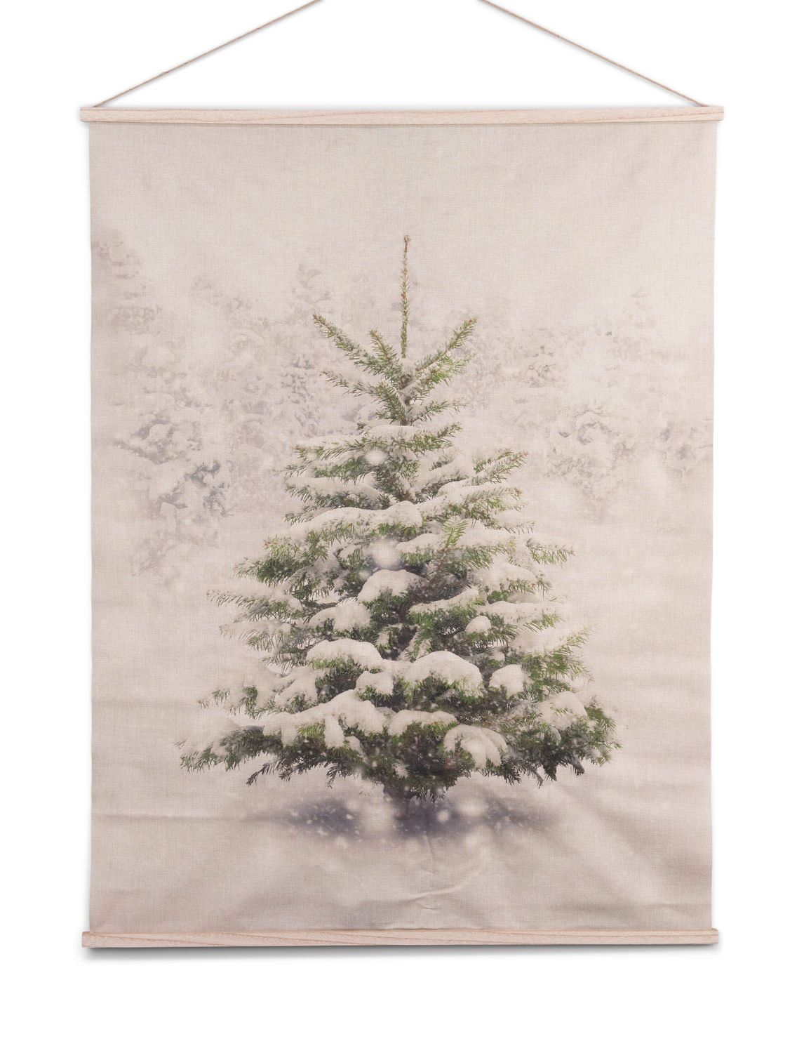 Introducing the Tree Banner With LED Lights from HOM Furniture! Bring a touch of holiday magic into your home with this stunning piece of holiday art. The design features a beautiful soft green and white polyester material canvas with a festive tree motif, perfect for indoor use. The MDF top and bottom board ensure durability, while the 100% linen polyester canvas adds a touch of elegance. The 60 warm white fiber optics create a mesmerizing glow, complemented by the built-in LED lights for added sparkle. Simply insert 3 AA batteries (not included) and watch as this Tree Banner lights up your space with holiday cheer.