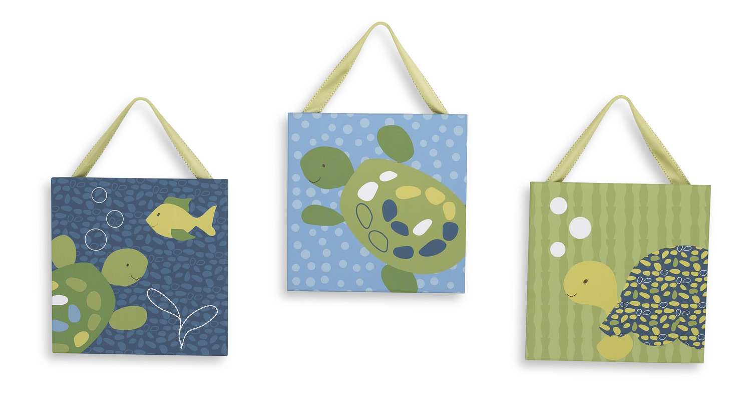 Turtle Reef Set of 3 Canvas Wall Art by Cocalo enhances the look of your baby's nursery with adorable turtles and fish amid a tropical theme. Coordinates with the Turtle Reef by Cocalo bedding collection (sold separately).