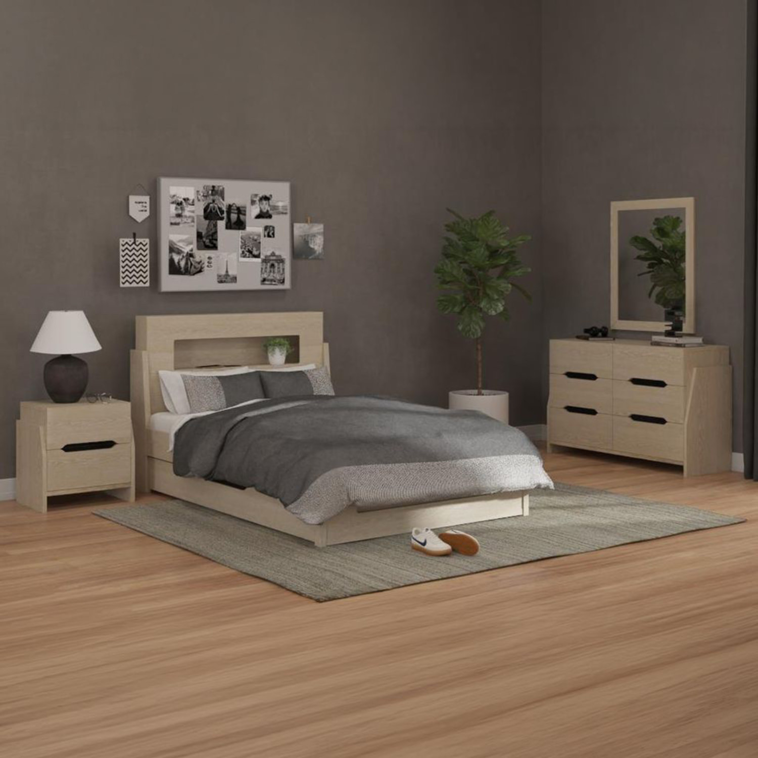 Transform your bedroom into a modern oasis with the Ravens Edge Bedroom Suite by HOM Furniture. This stunning suite features an open headboard storage for convenient organization, perfect for displaying your favorite books or décor. Crafted from oak veneer wood with a beautiful finish, this bedroom suite is both durable and stylish. The USB-powered lights add a touch of convenience, while the 350 lb weight capacity ensures quality and longevity. No box spring needed, making assembly a breeze. Complete the look with the trundle (sold separately) for added functionality. The suite includes a bed, dresser, mirror, and nightstand.