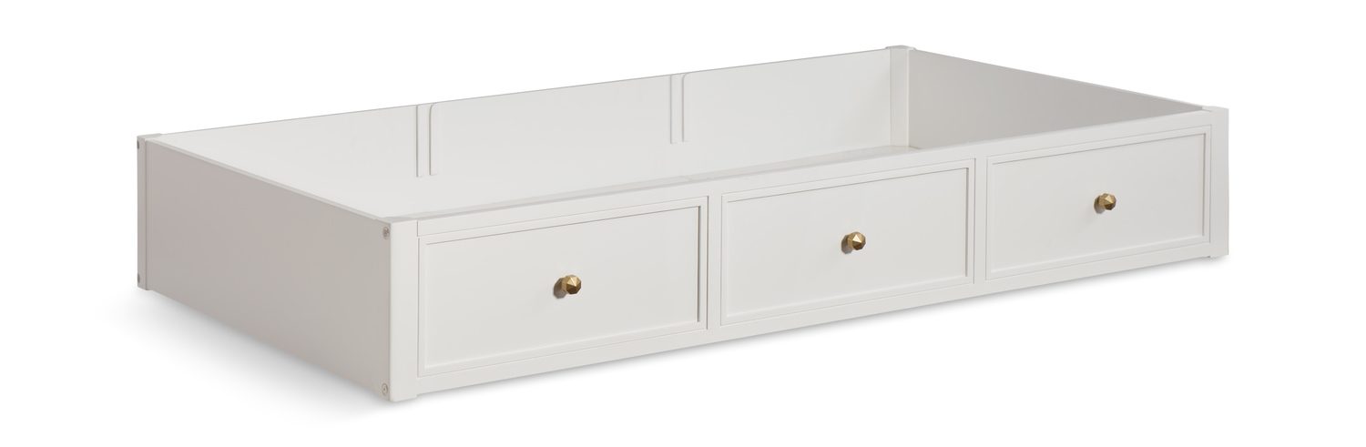The Chelsea Trundle Storage Drawer is a great addition to be paired with the Chelsea Youth Bed. This piece is designed with style and function in mind. The entire box is on casters so it can easily slide under the bed to be tucked away. You can use it for storing extra clothes or toys, or you can remove the dividers and add a twin size mattress to be used as a trundle for special overnight guests. The design coordinates with the other Chelsea bedroom collection so you can have a complete room design without much work! Note, bed rails must be in high position.