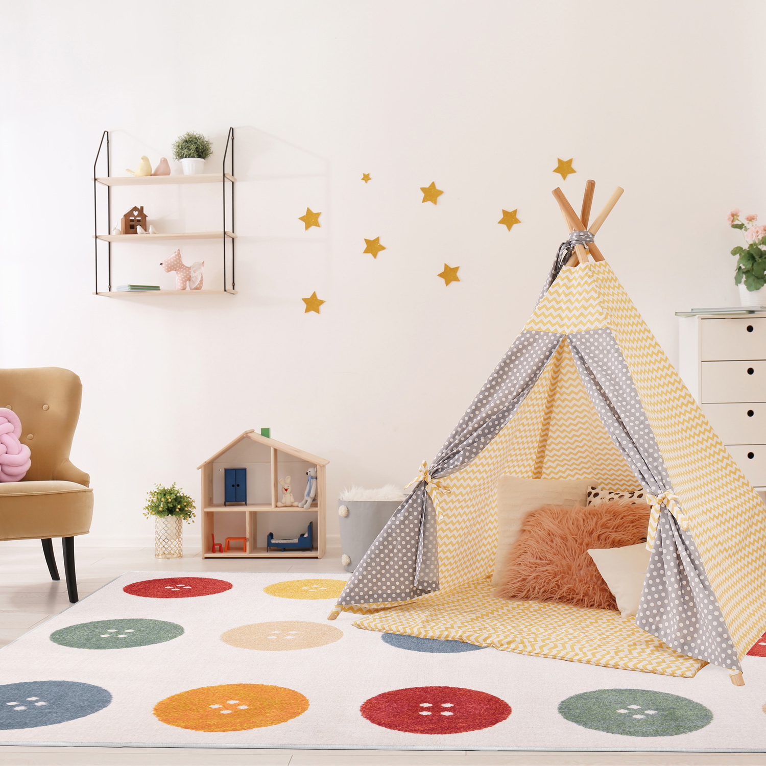 Experience the joy of boundless imagination with the vibrant Buttons Area Rug from our Playroom Collection. Bursting with a kaleidoscope of colors, this ivory rug is adorned with oversized, multi-colored buttons that will ignite your child's creativity. Crafted from high-quality polypropylene, not only is the Buttons rug irresistibly soft and playful, but it is also incredibly easy to clean. Designed to withstand the test of time and endless childhood adventures, this parent-friendly rug will maintain its youthful appearance for years to come. Embrace everlasting youth and infuse your home with the youthful energy of the Buttons area rug.