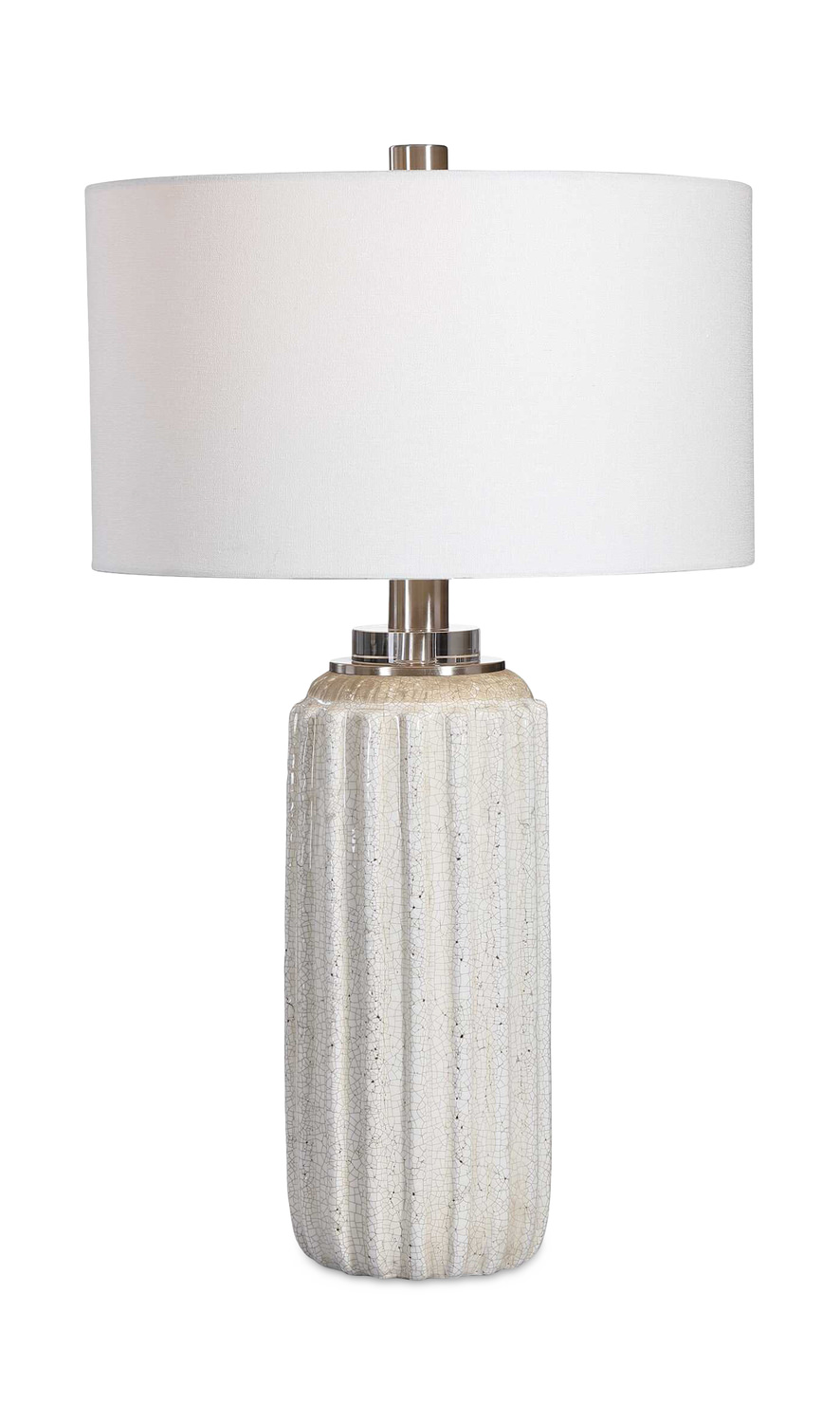- A Nod To Old-world Style, This Ceramic Table Lamp Features A Distressed Cream And Beige Crackle Glaze With A Deep Ribbed Texture, Accented By Brushed Nickel And Crystal Details.