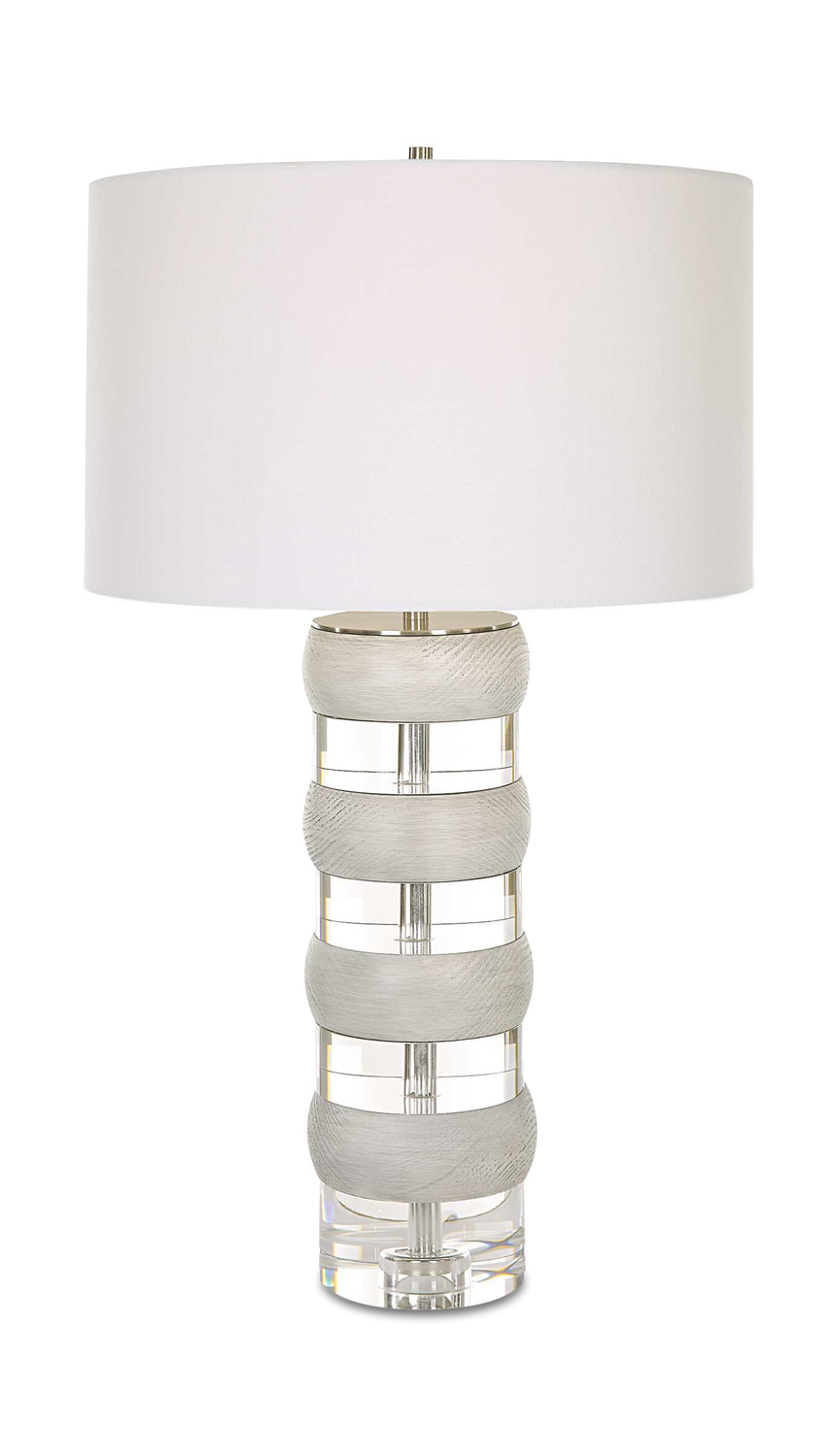 - The Band Together Table Lamp Displays A Unique Pairing Of Stacked Thick Crystal And Bleached Wooden Discs, Accented By Brushed Nickel Plated Iron Details.