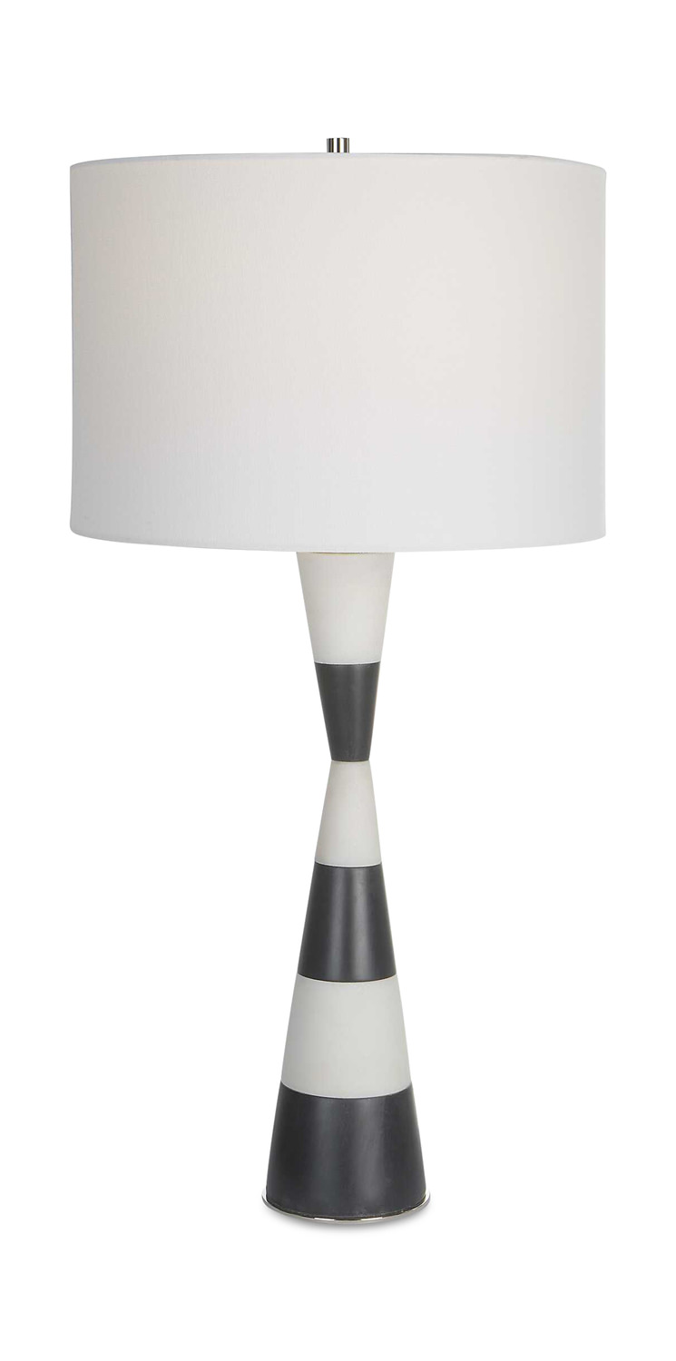 Illuminate your space with the exquisite Bandeau Banded Stone Table Lamp from HOM Furniture. This stunning lamp is crafted from a banded black and white man-made stone that beautifully accentuates its hourglass shape, closely resembling the luxurious Thassos marble. The iron details are elegantly finished in polished nickel, adding a touch of sophistication to its design. Paired with a white linen fabric drum shade, this table lamp exudes a sense of elegance and style. The black color adds a modern touch to any room decor. As part of the Uttermost brand, you can trust in the quality and craftsmanship of this piece.
